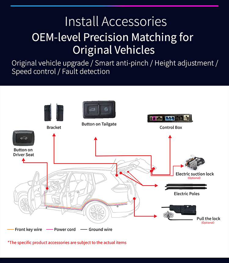 One-button remote control / Manual control / Height adjustmen / Audible warning / anti-pinch / Driving seat button / Foot sensor (optional) / Electric suction lock
