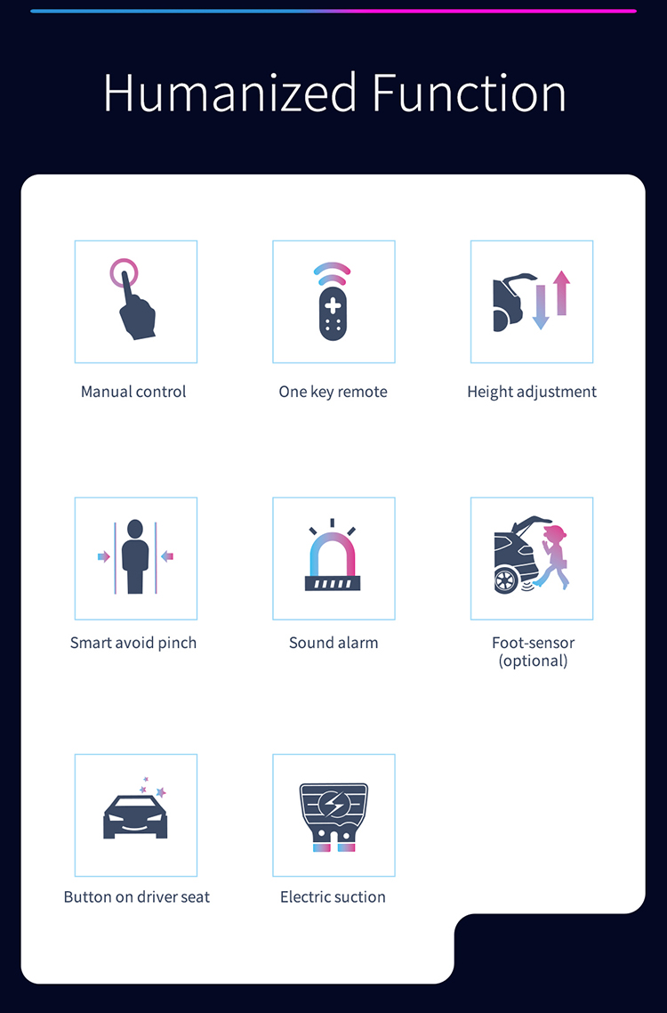 One-button remote control / Manual control / Height adjustmen / Audible warning / anti-pinch / Driving seat button / Foot sensor (optional) / Electric suction lock