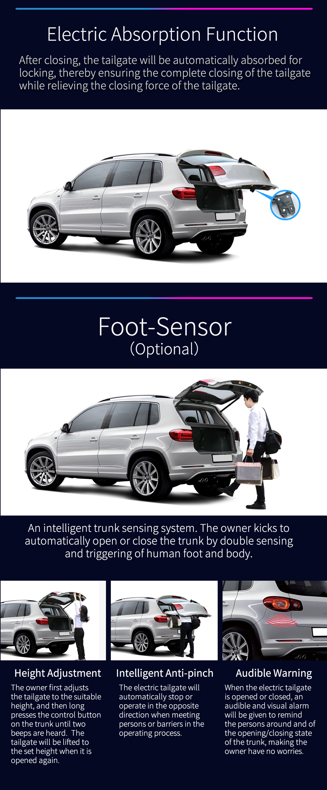 One-button remote control / Manual control / Height adjustmen / Audible warning / anti-pinch / Driving seat button / Foot sensor (optional) / Electric suction lock